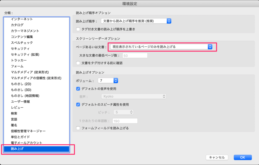 分類の【読み上げ】を選んで、スクリーンリーダーオプションという箇所の、ページあるいは文書で【現在表示されているページのみを読み上げる】を選択して【OK】をクリックすればオッケー。