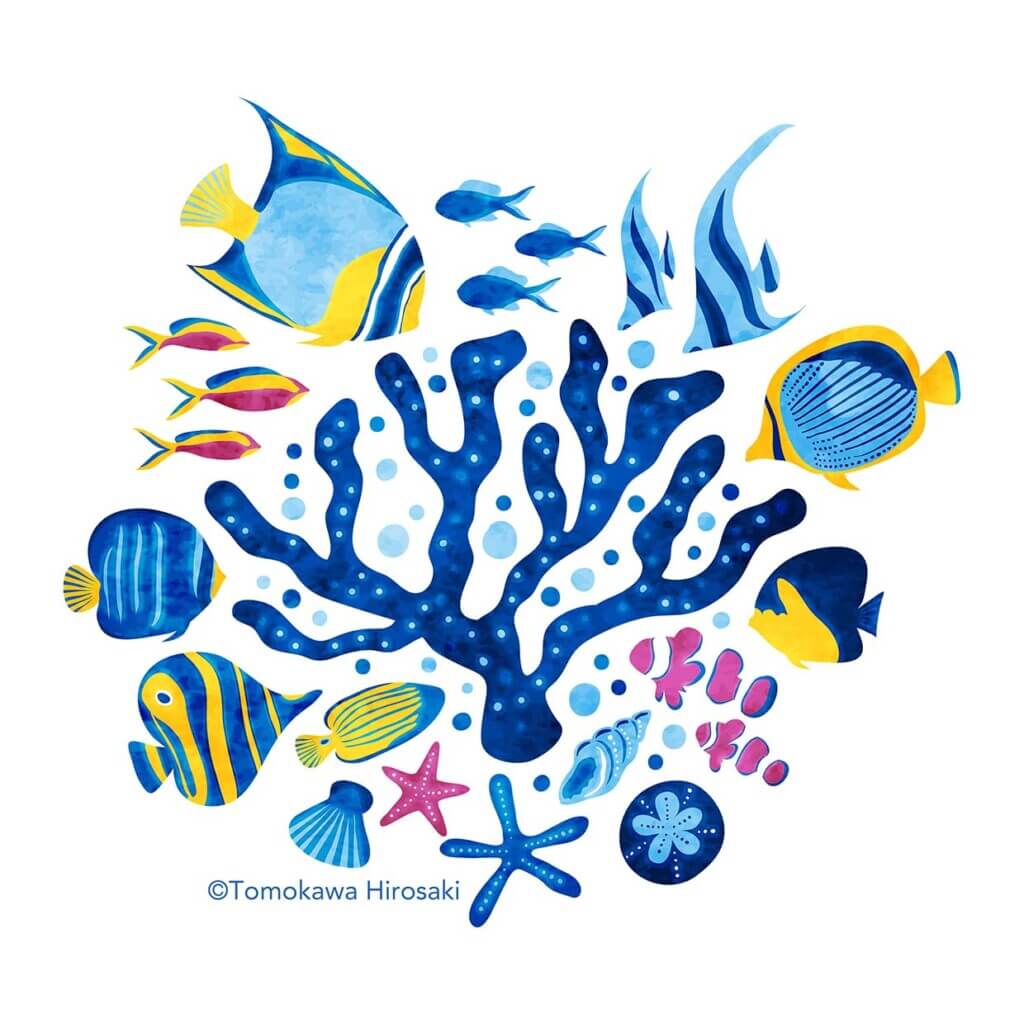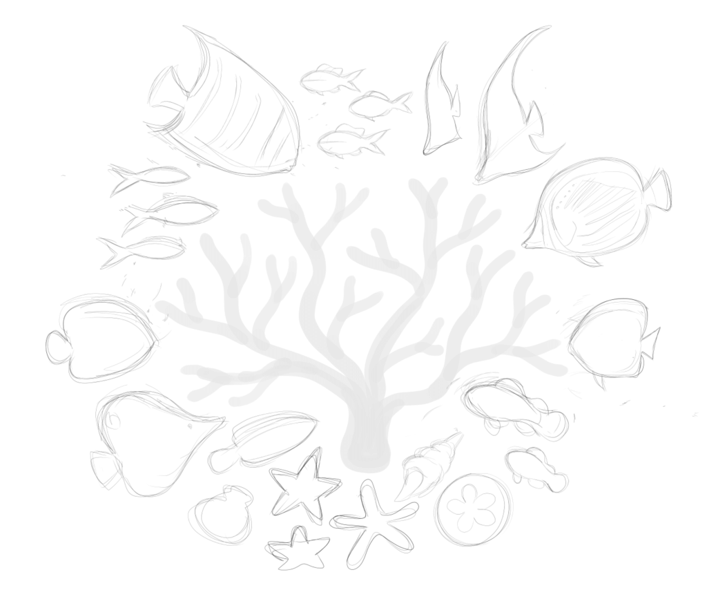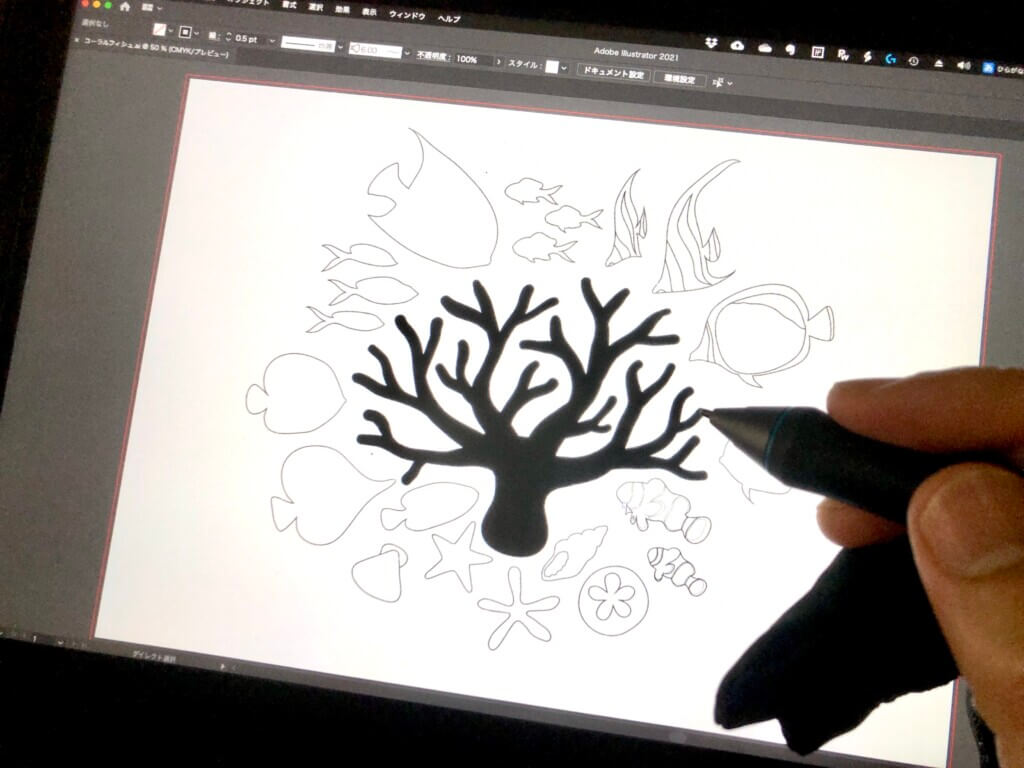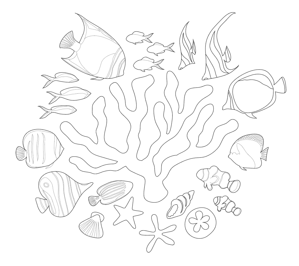 こちらがIllustratorでトレースした状態。 珊瑚の枝ぶりや魚の大きさや向きも少し調整しました。