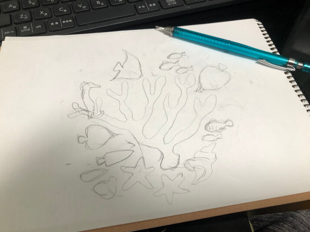 CLIP STUDIO PAINT PROで全体のバランスを考えながら更に描き込んでいきます。この時点でどんな種類の魚を描くかも決定しておきます。下絵ができたらJPG画像としてファイルを書き出します。