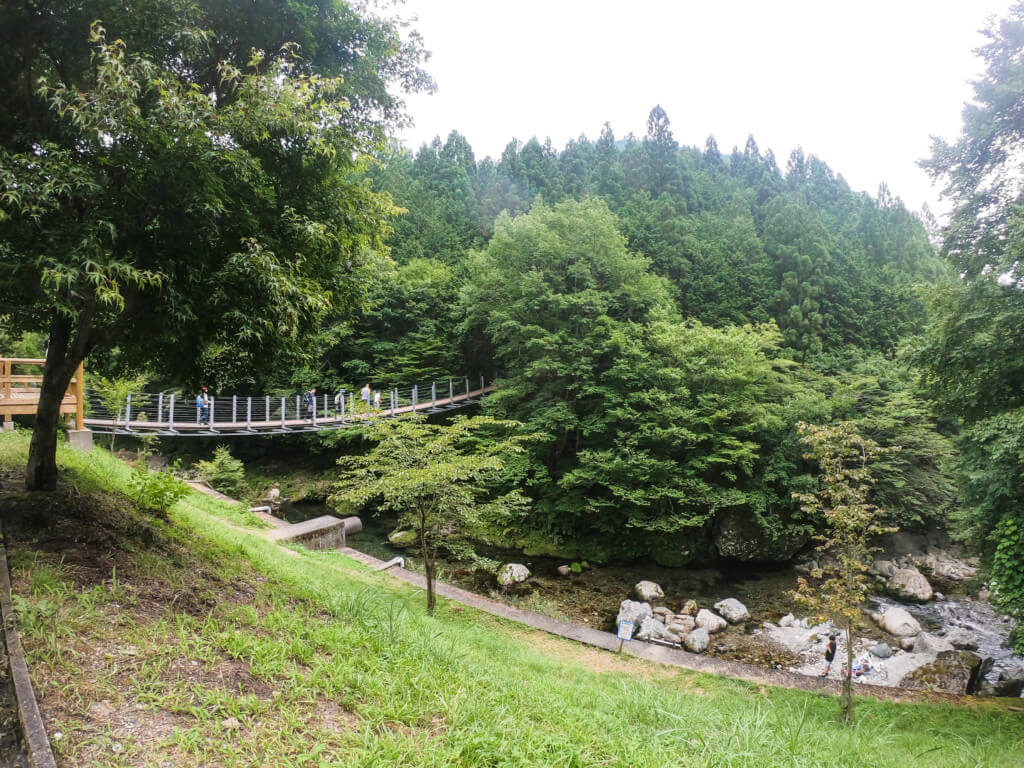 駐車場から見える吊橋を渡ってから川に降りられます。