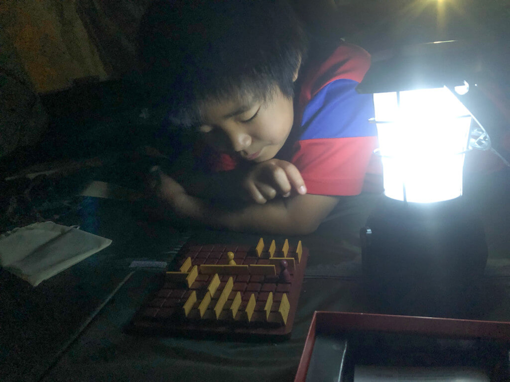 次男と一緒に少しの間だけワイワイしながらコリドール・ミニで遊んだ後、テント内も消灯としました。