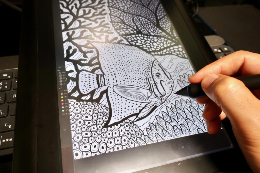 実は魚のペン入れよりも背景にする珊瑚のペン入れの方が時間も手間もかかったりするのです。