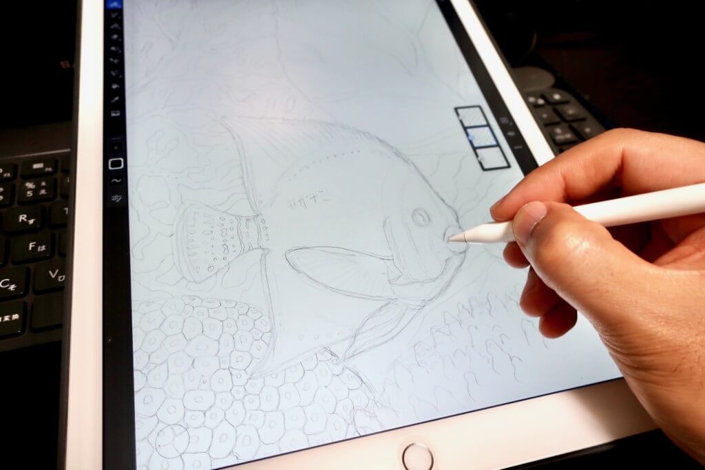 サザナミヤッコは今までに描いたことのない魚なので、事前にいい感じの写真をネットで調べて、いくつかピックアップした写真を参考にしながらiPadで下絵を描いていきます。