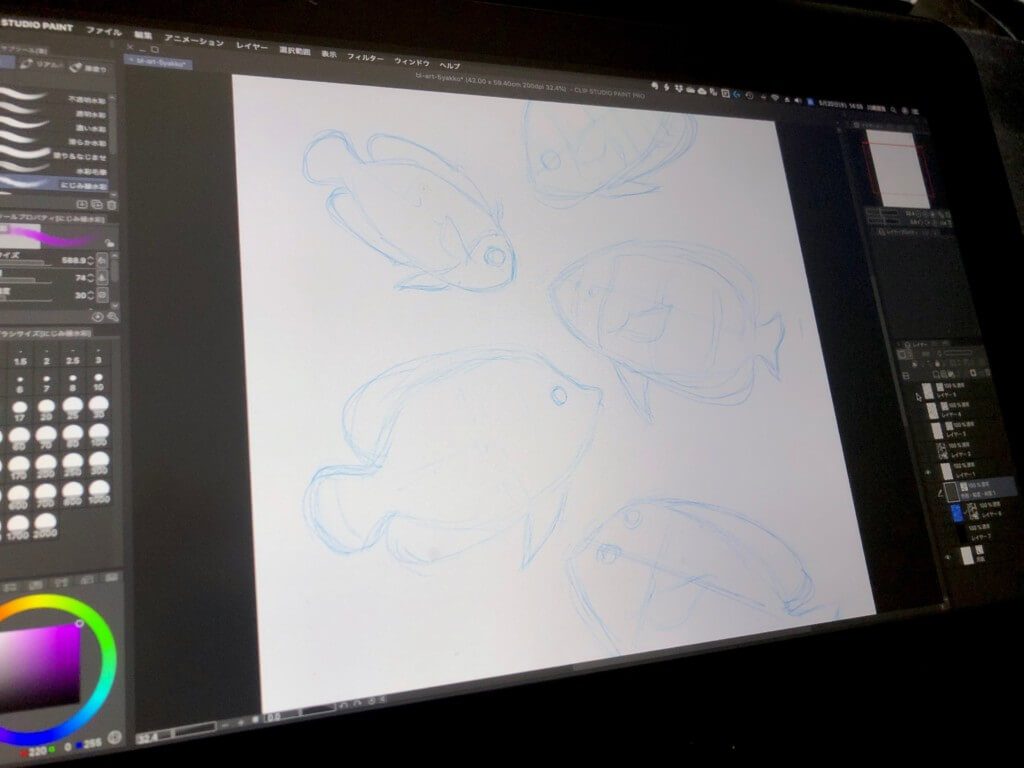 アナログの作業の場合、魚の大きさや位置など構図で失敗すると、最初から書き直しになってしまうんですが、デジタルの場合は描いた魚の大きさや位置を自由に変更が可能!
