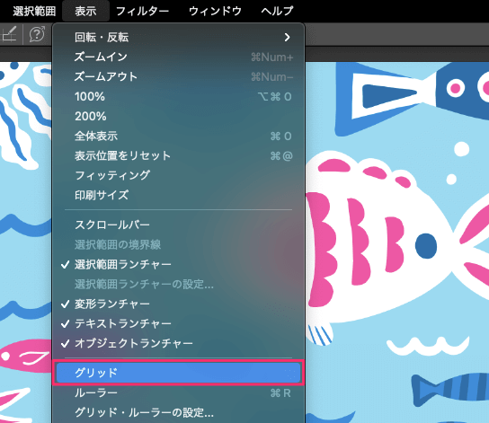 魚の向きがが微妙に右や左に傾いていたので水平に直していきます。CLIP STUDIO PAINTのメニューから【表示】→【グリッド】を選びます。