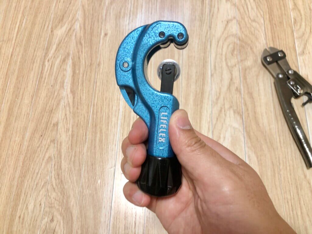 このパイプカッターでなくても、金属が切断できるものならどれでもオッケー。