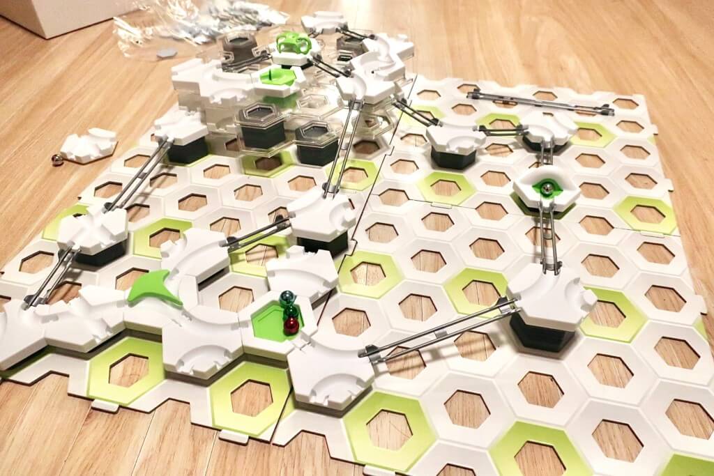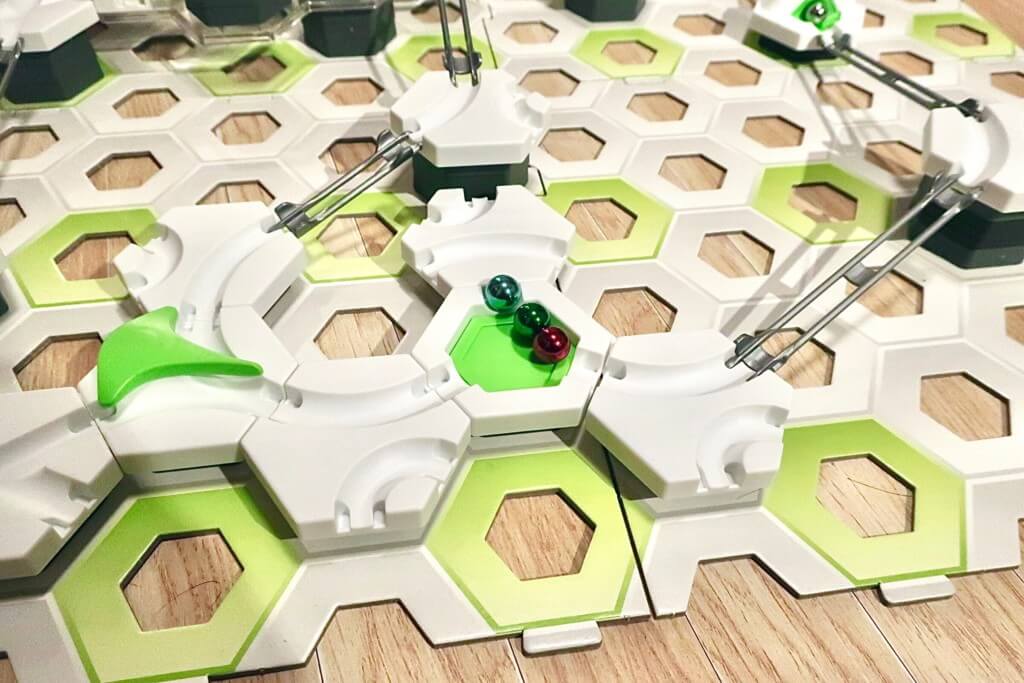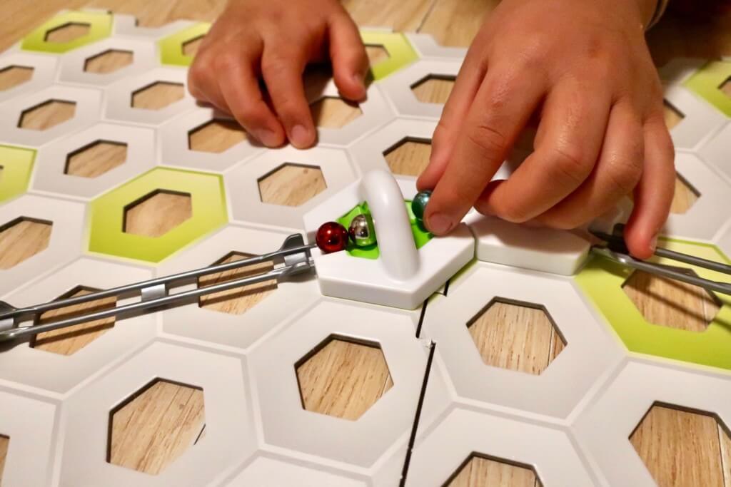GraviTraxを子供と一緒にやってみると、意外と頭の中で思い描いたように玉が転がってくれず、途中で玉が脱線してしまったり、止まってしまうことも。