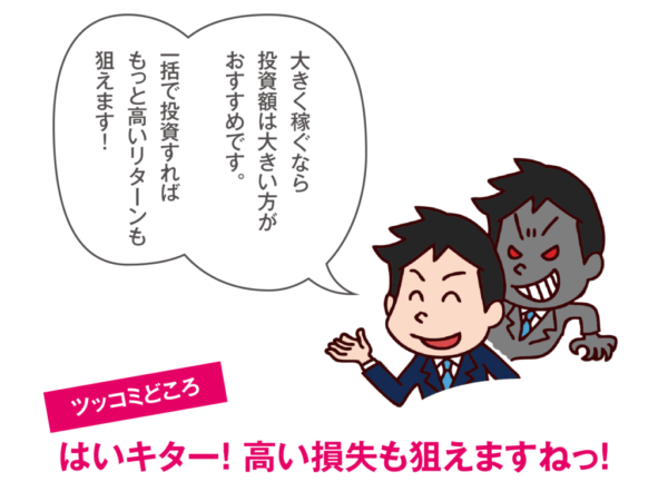 まともな金融機関なら積立投資という提案もあるかと思いますが、相手が詐欺師なら、できるだけ多くのお金を一括で投資させようとするはずです。