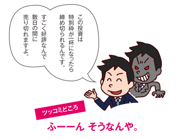 「この投資で資産が2倍になった人もいるんです! 絶対儲かりますよ」みたいな感じで他のお客さんの成功事例を紹介してくると思いますが、そんなしょーもない話に興奮せず冷静になりましょう!