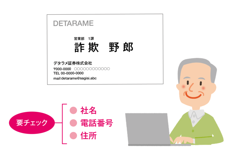 ちゃんと電話は使われていて、誰かが電話対応しているかを確認しましょう。また、全然関係ない会社の電話番号を勝手に名刺に記載している可能性もあるので、電話に出た人に勧誘された投資について2、3ほど質問してみることをおすすめします。