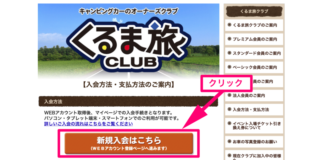 まずは「くるま旅クラブ」の公式サイトの【入会はこちら】をクリック。