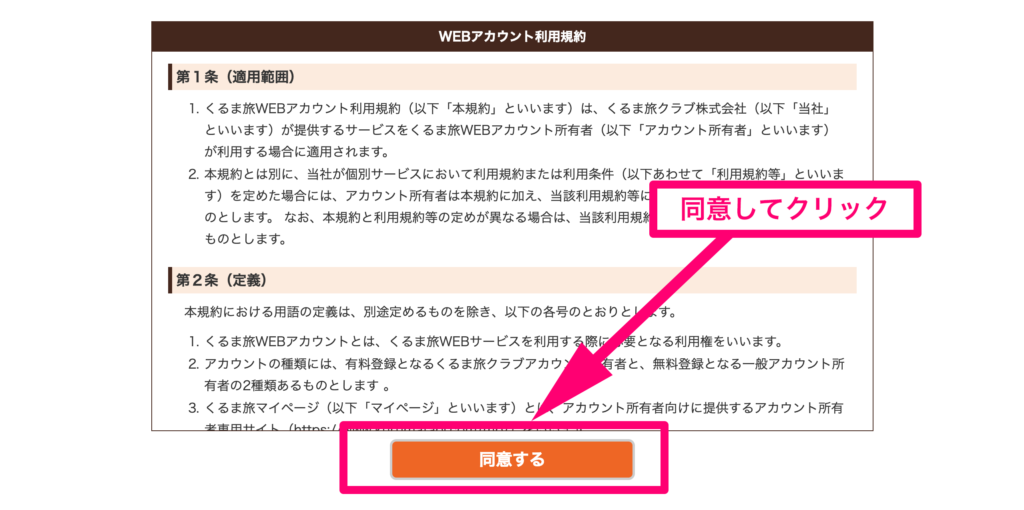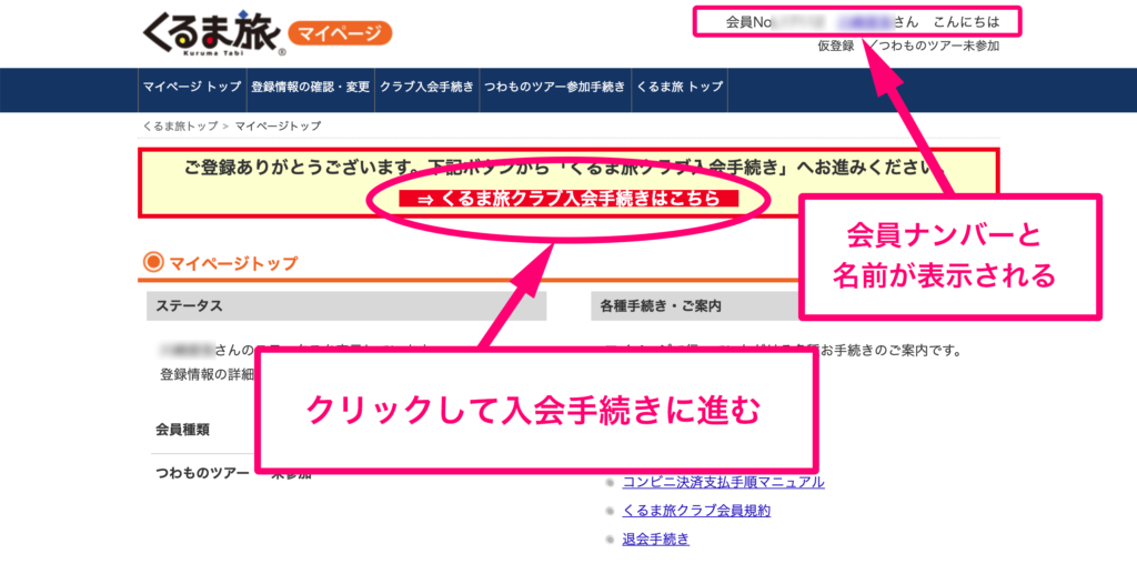 ログインできたら【くるま旅クラブ入会手続きはこちら】をクリックして先に進みます。