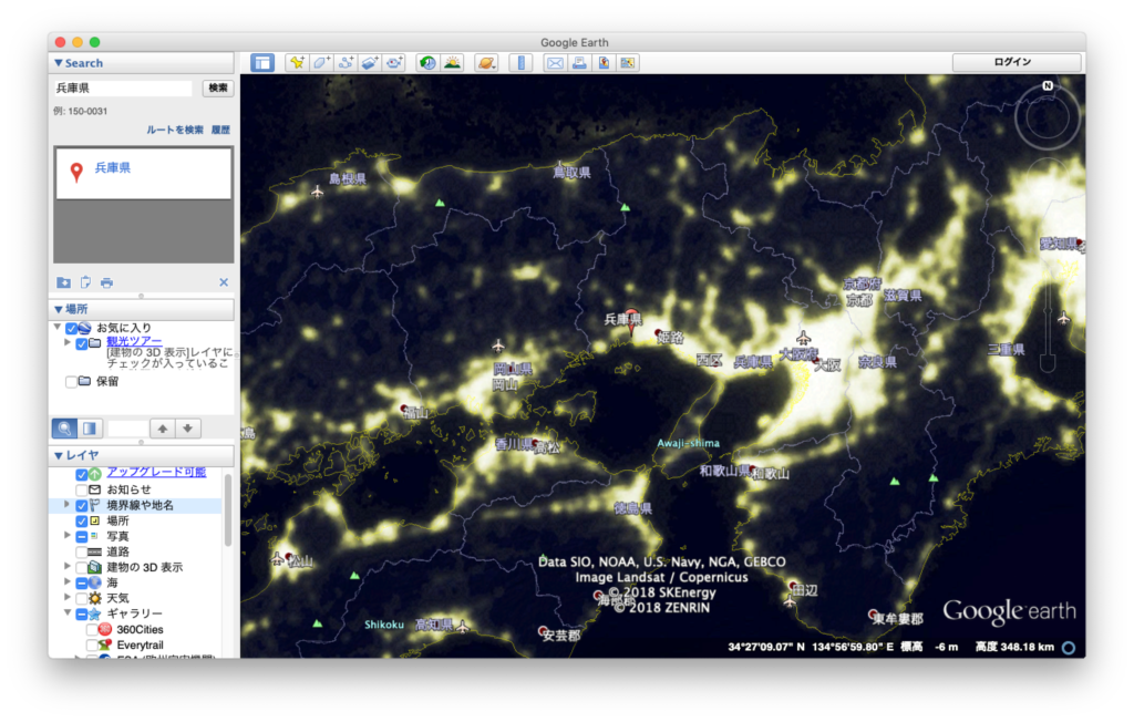 星空を撮影するためには光害マップをチェックする必要がありますが、Google Earthで光害マップを表示させることができます。