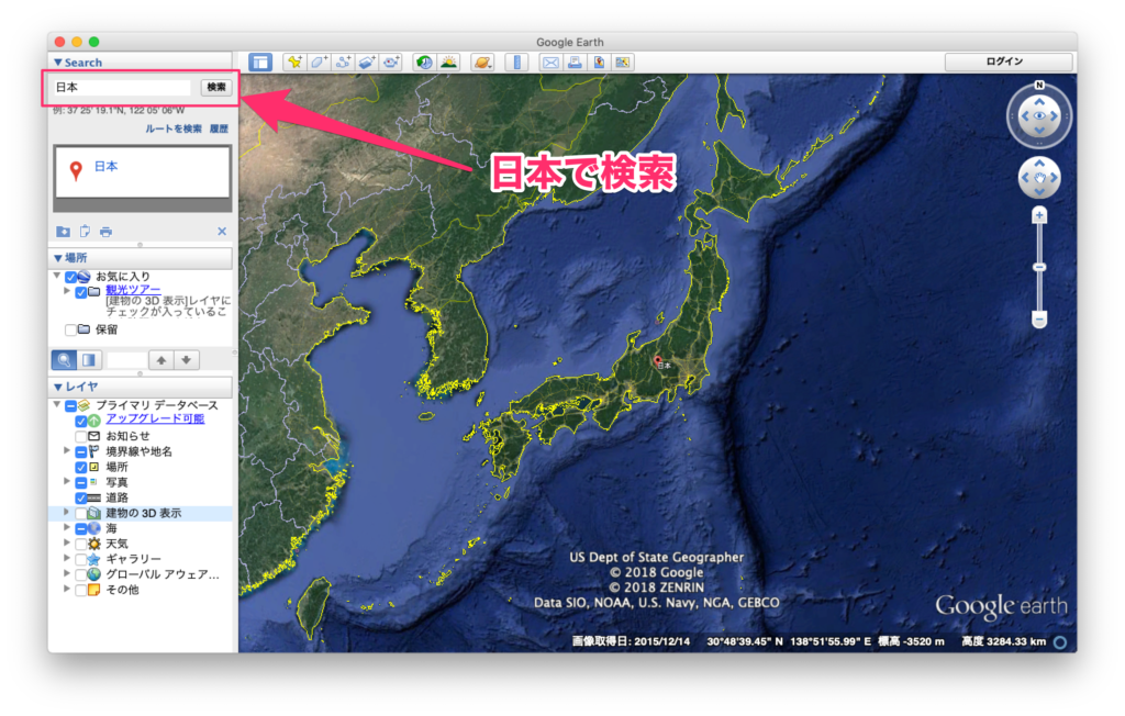 Google Earthを起動して日本を検索したときの画面ですが、この時点では地形が表示されています。