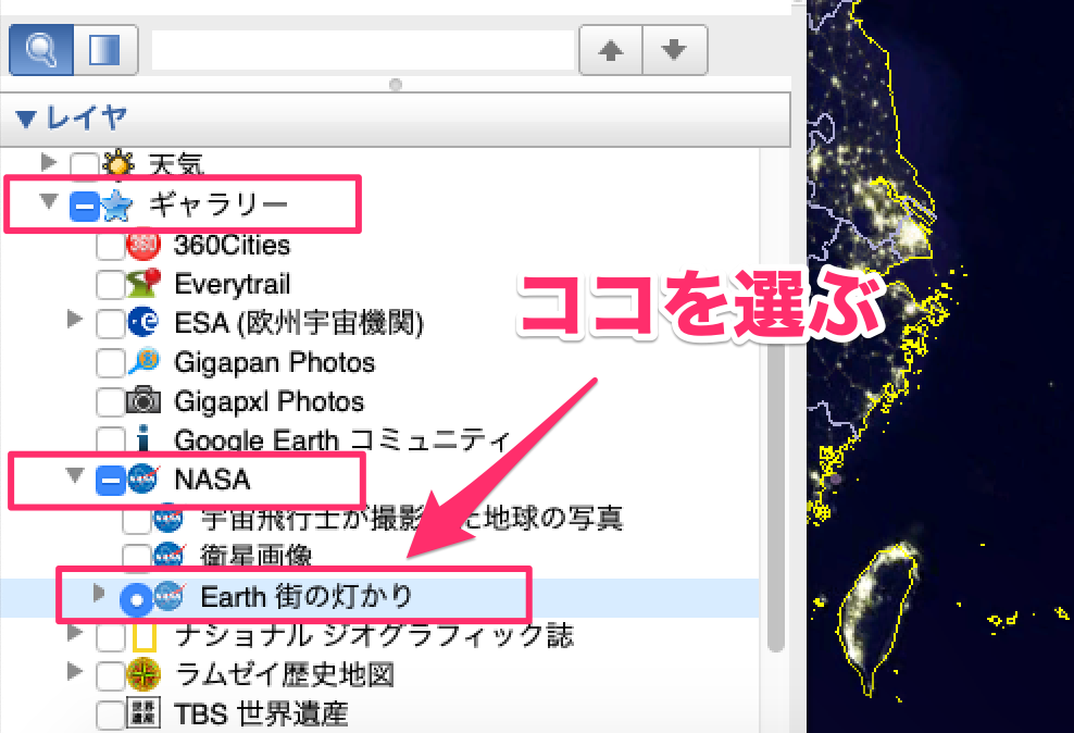 画面左下に【レイヤ】があるので、【ギャラリー】→【NASA】→【Earth街のあかり】を選びます。