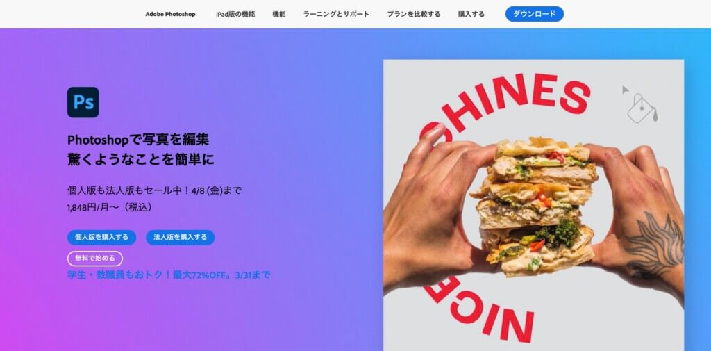 写真の編集・加工ソフトとして有名なソフトですが、ペイント系のお絵描きソフトとしての機能も十分備わっているので、水彩画のような表現が得意。Photoshop単体プランよりも、Lightroomも利用できる「Creative Cloudフォトプラン」の方が値段が安いのでおすすめです。
