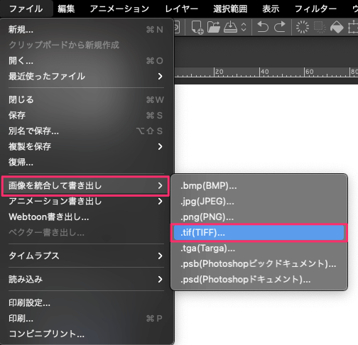 トレースが終わったら【ファイル】→【画像を統合して書き出し】→【.tif(TIFF)】を選んでtif形式の画像ファイルとして保存します。