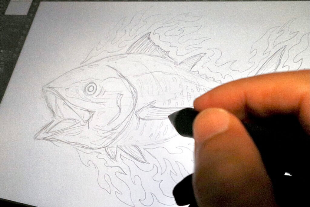 マグロの特徴をつかみながら、だいたいの完成イメージを描いていきます。