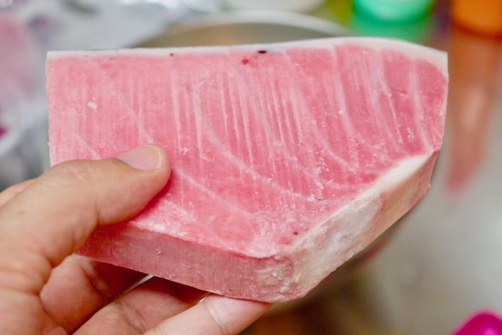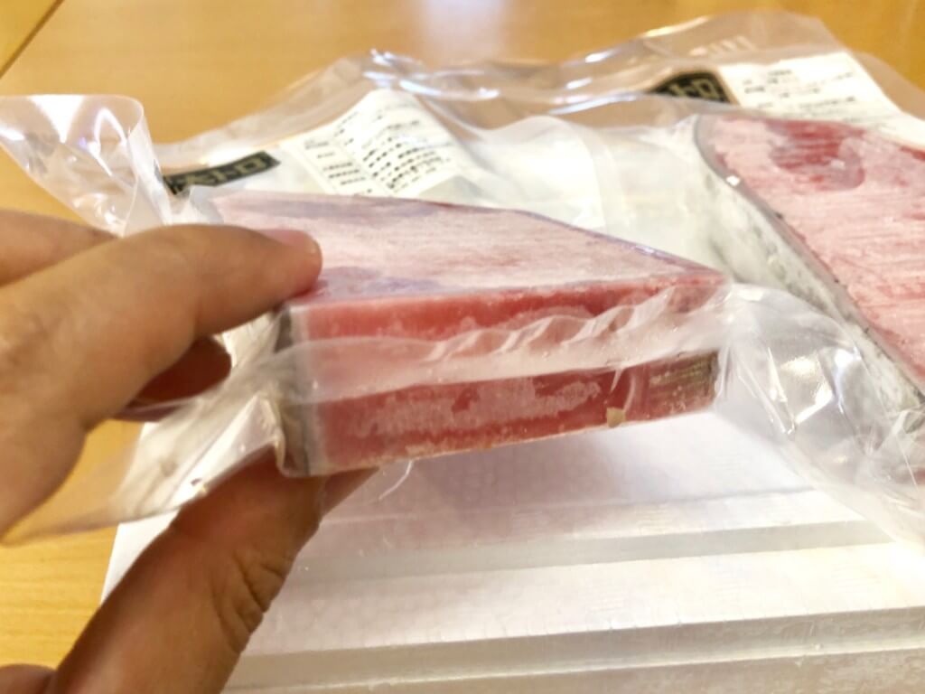 冷凍マグロは、冷蔵庫で6時間〜8時間かけて解凍するのがいいそうなので、午前中に届いたマグロを夕食に食べられるように、お昼から解凍を開始しました。