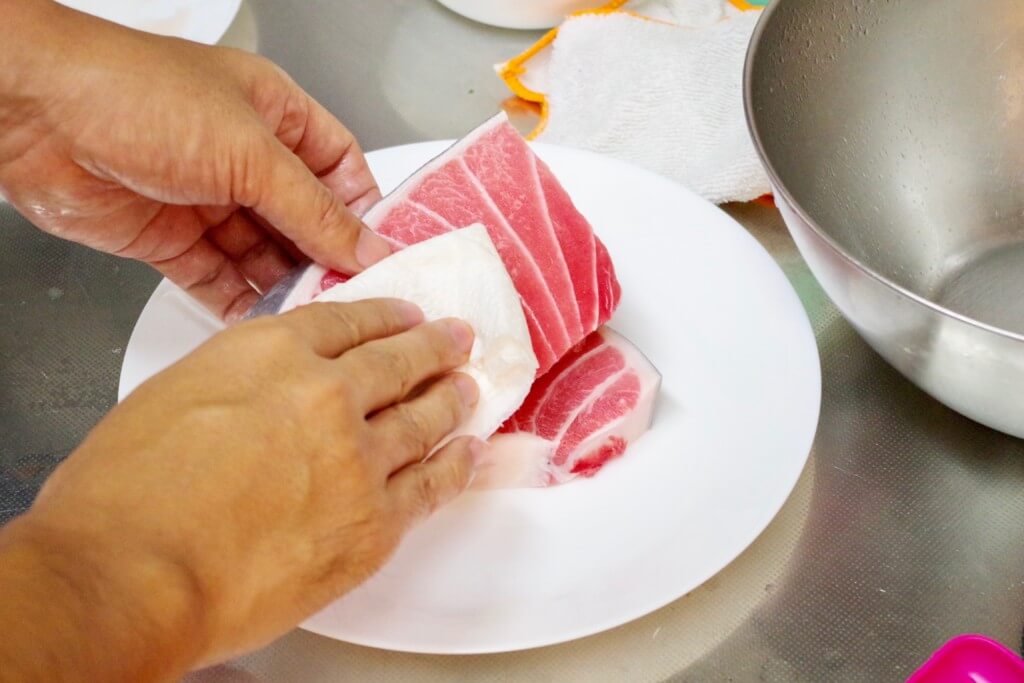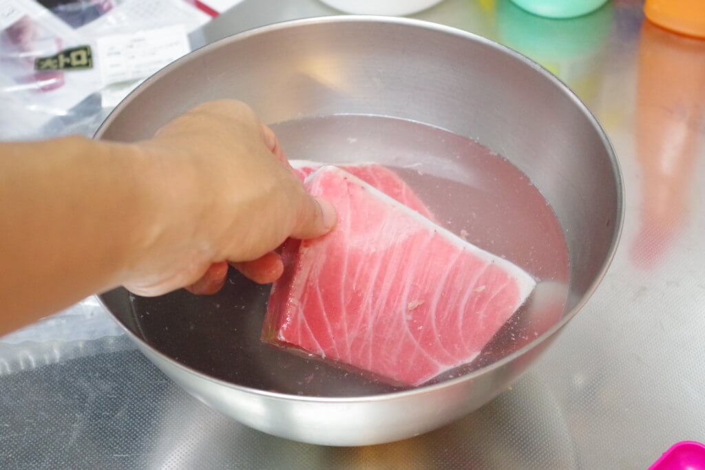 マグロの表面に白っぽい粉のようなものが付着しているので、丁寧に手で洗い落とします。