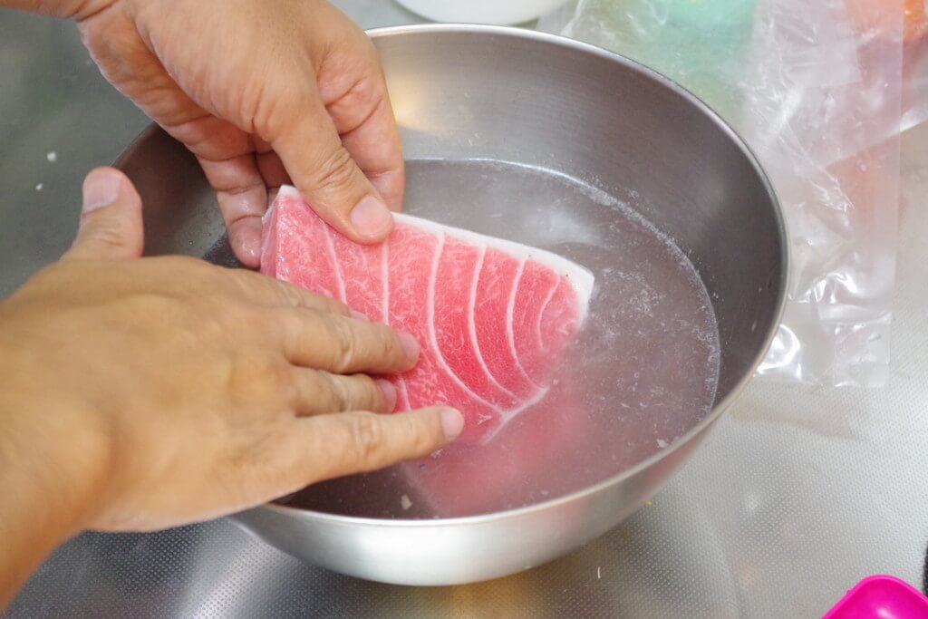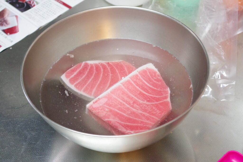 既に塩水にはマグロの油がたっぷり浮いてきています。