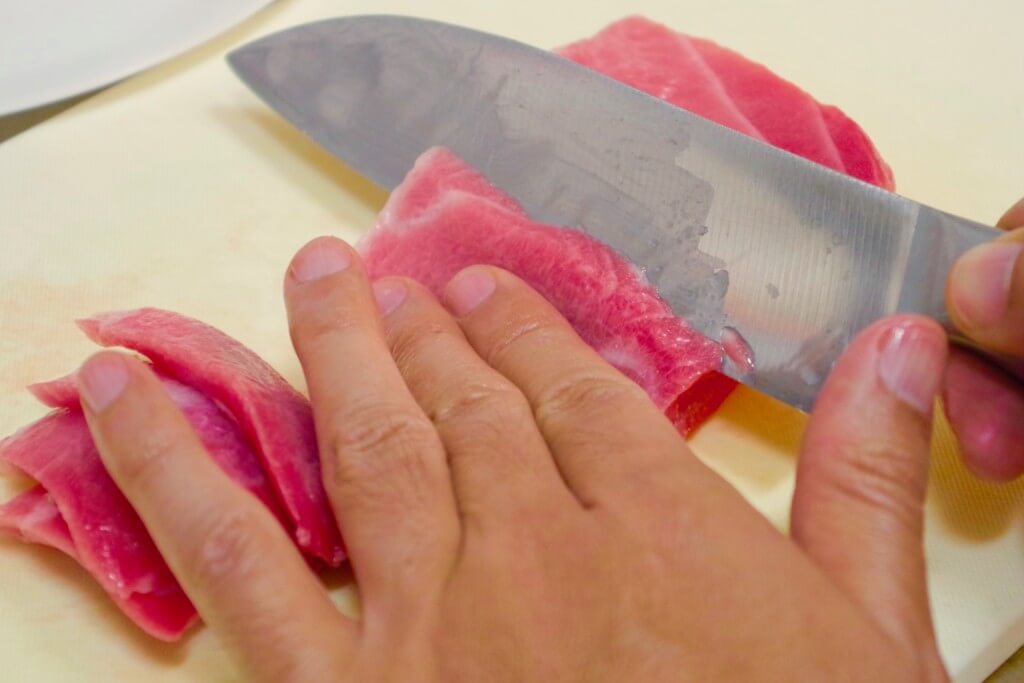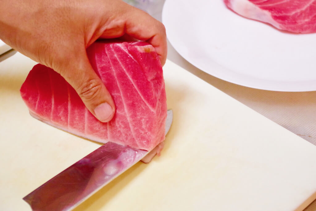 解凍できたマグロの冊を切っていくわけですが、魚は手早く切っていくのがおすすめ。