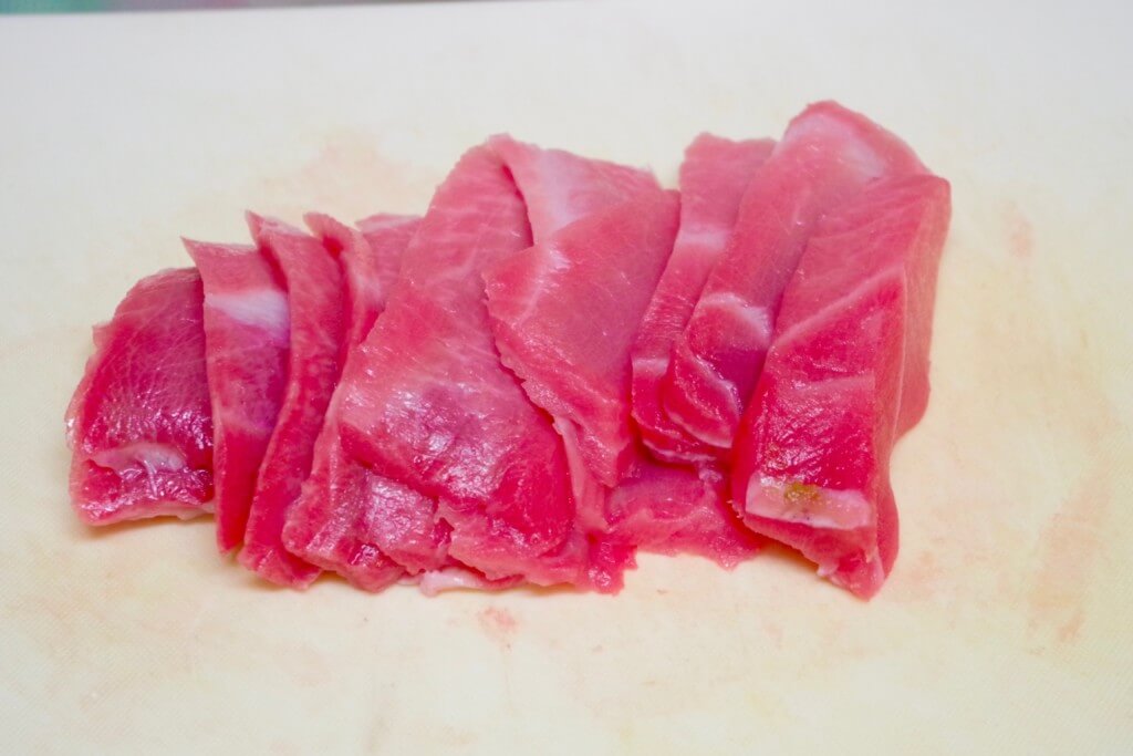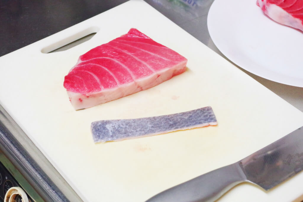 マグロの皮を削いだのは初めてでしたが、冊が扱いやすいサイズになっていたので、意外と簡単にできました。