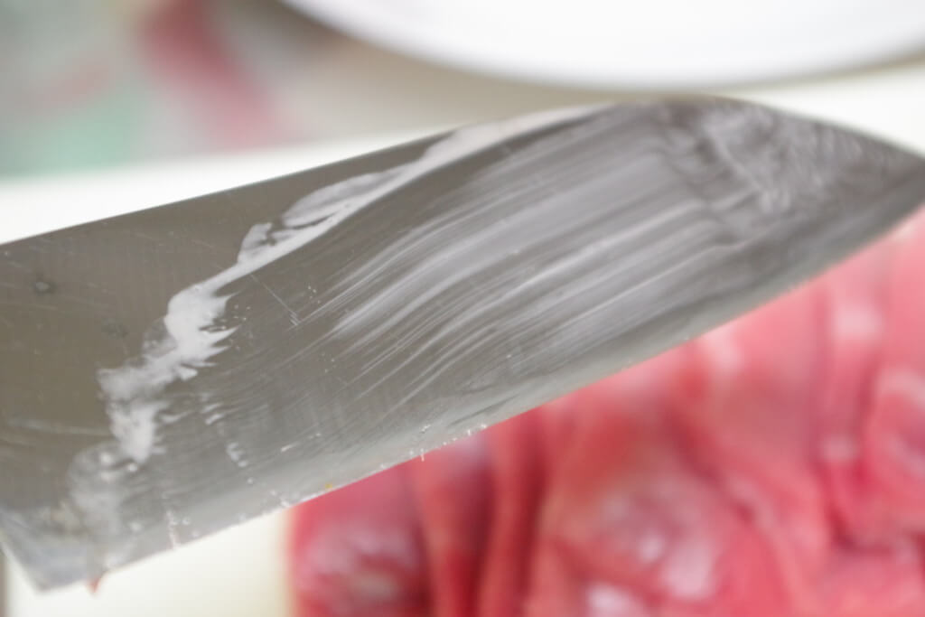 大トロのマグロを1冊切った後の包丁には油がベッタリです!