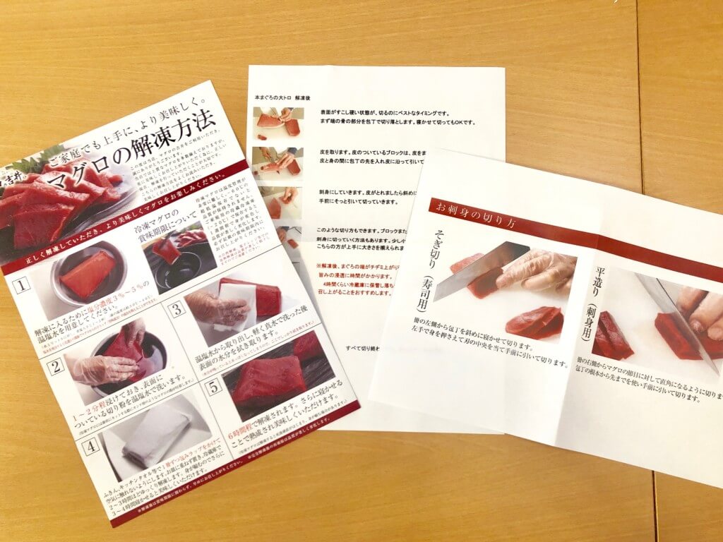 冷凍マグロの解凍の方法から、マグロの柵の切り方まで丁寧な説明書付きなので安心。
