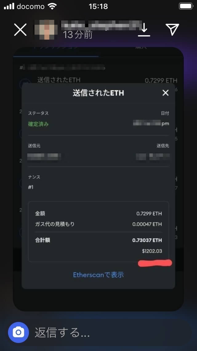 すると、「私は以前にもこのようにNFTを購入しました」という内容で、下記のようなスクショを送ってきました。