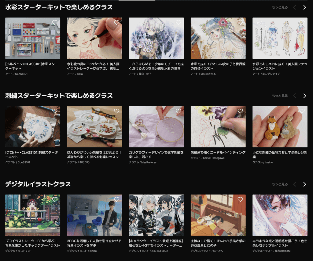 アナログイラスト、デジタルイラストだけでなく、クラフト、写真、動画、プログラミング、お料理まで、様々な分野の講座があるので、好きな講座を好きなだけ受講できるのも魅力です。