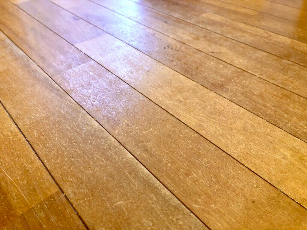 フローリングに傷がつかないのなんて最初のうちだけ、やっぱり数年使っているとこんなボロボロになっちゃいます。