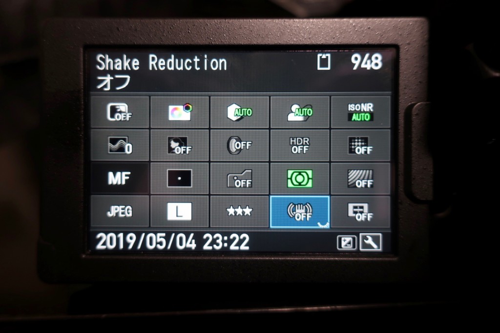 星空撮影では手ブレ補正機能はオフにしておきます。