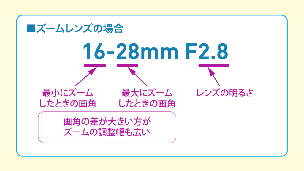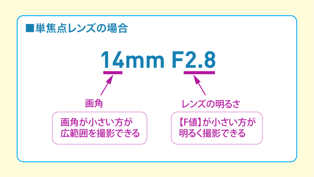 画角が調整できない単焦点レンズと、画角が調整できるズームレンズがありますが、それぞれでスペックの見方を簡単に解説します。