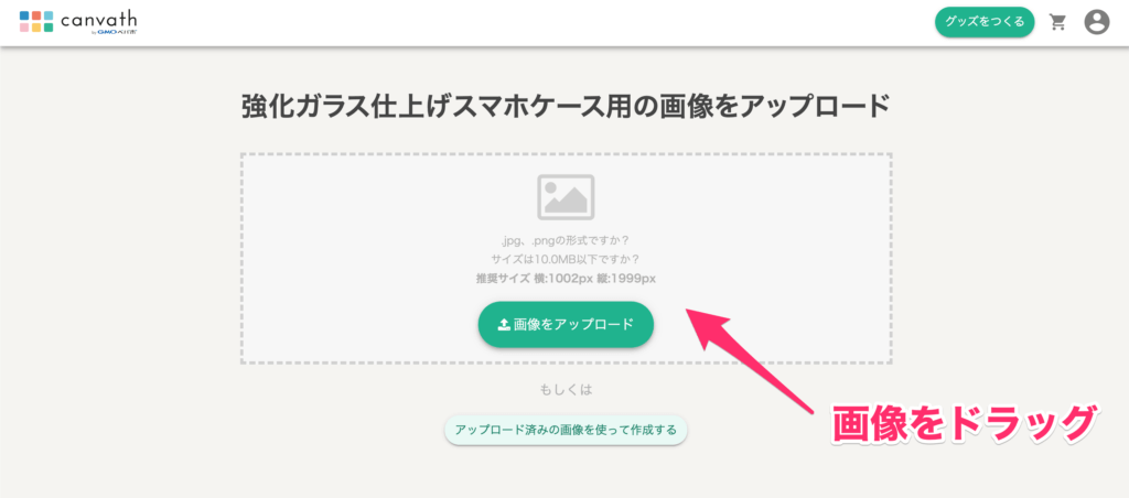 オリジナルのスマホケースケースを作る画面に切り替わったら、自分で用意した画像をドラッグしてアップロードします。